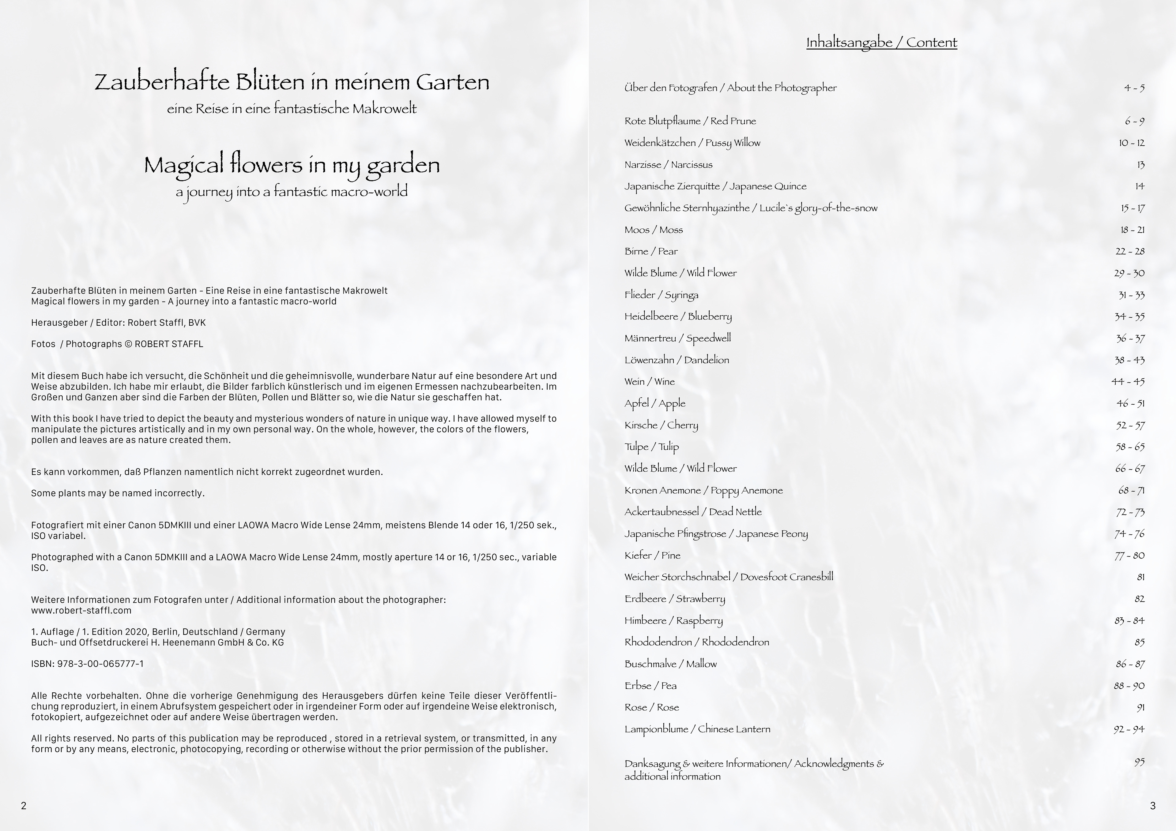 "Zauberhafte Blüten in meinem Garten / Magical flowers in my garden" Jedes Jahr im Frühling beginnt die magische Zeit. Blumen und Bäume bilden ihre Knospen und die Blütenzeit beginnt. Aber wie sieht eine Blüte eigentlich wirklich aus? Und wie sieht es IN einer Blüte aus? Mit einem speziellen Objektiv erkunde ich die mystische Makro Welt unseres privaten Gartens. Dabei habe ich Formen und Strukturen entdeckt, die ich vorher nie für möglich gehalten habe. Erkunden Sie mit diesem Buch die fantastische und mystische Welt der Blüten. Über das Kontaktformular unten können Sie das Buch für 39,99 Euro zzgl. 2,50 Euro Versandkosten direkt bei mir bestellen. ------ Every Spring a magicl time begins. The flowers and trees show their buds and the flowering period commences. But what does a flower really look like? And what about the INSIDE of a flower? With an exceptional lens, I explore the mystical macro-world of our private garden. I discovered forms and structures I never expected to see. Explore the fantastic and mystical world of flowers with this book. Buy the book via link below: 39,99 Euro plus 2,50 Euro shipping cost